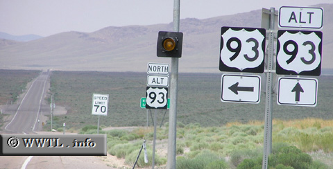 | (Junction Alt. Federal Route 93; White Pine County, Nevada) --Photo taken by Chris Elbert White Pine and Elko Counties, NV are served by Alt. Federal Route 93. Interestingly, the majority of the route coincides with a duplex on Interstate 80. |