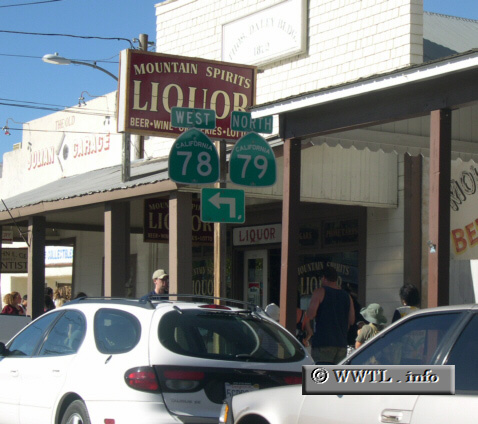 Julian is a well-preserved goldrush town in California. Its entire municipality is considered a California Historical Landmark (no. 412). The town began developing in the mid 19th century, and its original architecture has been maintained ever since. To help California motorists reach the destination, State Routes 78 and 79 convene for a short distance. | ![]() |