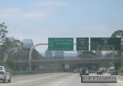Motorists have the choice of downtown San Diego (in the background), National City via Interstate 5 south, or Los Angeles via Interstate 5 north.
