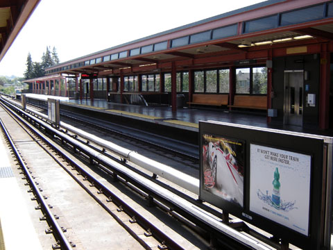 The Hayward Station, akin to other stations in the San Francisco East Bay, uses elevated rail. You're looking south towards the next major stop: South Hayward Station.
