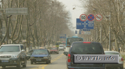 (Westbound Huning Expressway; Nanjing, Jiangsu Province)--Photo taken by Dan Peri Welcome to Nanjing, an average-sized Chinese city of 5.5 million inhabitants. Once the Huning Expressway enters town, it quickly converts from being freeway to two-lane undivided. |