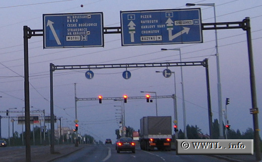 Near the western edges of town, forward signage is given to the cities of Pilsen, Bayreuth and Karlovy Vary.