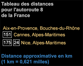 A8 est la seule super-route pour la Côte d'Azur. Plusieurs Français, Monegasques et les Italiens utilisent la route tous les jours. Le terminus oriental est à la frontière Italiene, oû les villes de Vintimille et Gênes est proche.
