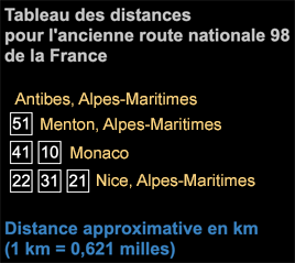 La N98 a suivi la Côte d'Azur. La route a été déclassifié en plusieures routes départementales. Son voyage est brièvement interrompu par le pays de Monaco, où le Carrefour du Portier se relie lex deux segments de la route française.