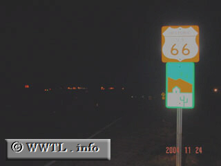 ![]() (Eastbound former Federal Route 66; Mohave County, Arizona) --Photo taken by Carlos Rogers Map Location: 34.718, -114.48083 This picture was taken just east of the Colorado River crossing. The lights in the background come from the western-bank in California. |