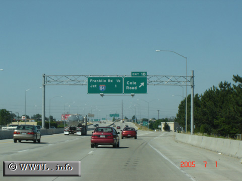 (Eastbound Interstate 184; Boise, Idaho)--Photo taken by Carlos RogersMap Location: 43.6107, -116.26869 Traffic counts are somewhat higher near the route's western terminus. The interchange with Interstate 84 is "Exit 0".