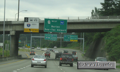 Near the route's southern-terminus, a carpool exit for Interstate 5 north is afforded. Also, advance-signage for WA-518 is given.