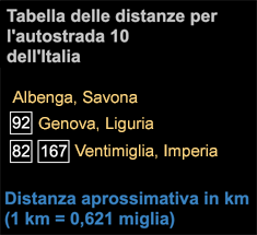 Autostrada 10, che ha molti trafori e pointi ascende e scende attraverso le Alpi del Sud. Attraversa Ventimiglia con Genova.