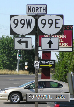 Junction OR99W and OR99E in Junction City. South of the junction is Oregon State Route 99. Yes, the junction of these three routes put the "junction" in Junction City. As logic would tell you, the car in the photograph is waiting near the junction of Junction City because junction-based traffic maintains the right-of-way. <<<Previous