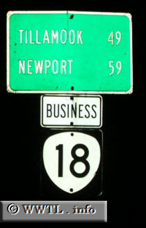 Business Route 18, formerly a section of mainline Oregon State Route 18, connects Willamina and Sheridan. As indicated by the mileage-sign above, the route seems to be a widely-used corridor for some on travels to coastal communities.