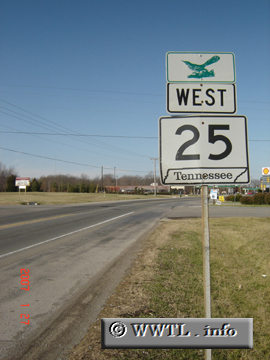 ![]() (Westbound State Route 25; Cross Plains, Tennessee) --Photo taken by Carlos Rogers Map Location: 36.52834, -86.64505 Tennessee State Route 25 stretches across the northern tier of Tennessee, from South Carthage to its western terminus at Tennessee State Route 49. |