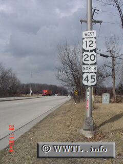![]() (Northbound LaGrange Road; Cook County, Illinois) --Photo taken by Carlos Rogers Map Location: 41.76519, -87.86731 With Lake Michigan being a barrier for east-west highways, both Federal Route 12 and Federal Route 20 jump on the back of Federal Route 45 near Chicago. After this short triplex, both Federal Route 12 and 20 depart towards northern Indiana. | ![]() |