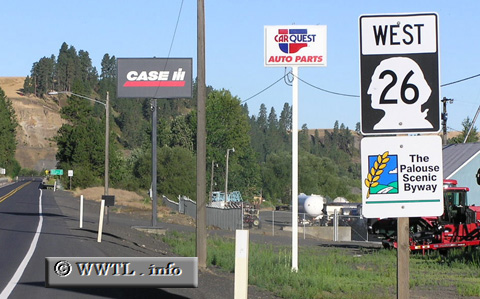 ![]() (Westbound State Route 26; Colfax, Washington State) --Photo taken by Chris Elbert Map Location: 46.89094, -117.37041 State Route 26, partially a constituent of the Palouse Scenic Byway and once the former northern constituent of Federal Route 295, connects Whitman County with the counties of eastern and central Washington.