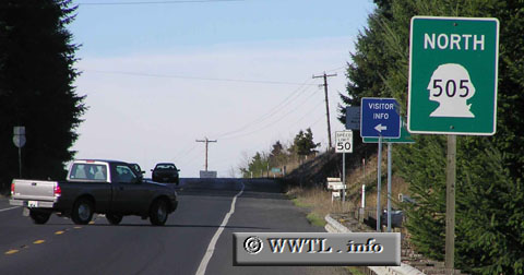 ![]() (Northbound State Route 505; Toledo, Washington State) --Photo taken by Chris Elbert Washington State Route 505 provides Toledo with access to Washington State Route 504 and Mt. Street Helens National Park. The namesake for the park is an active volcano which erupted in 1980 and killed fifty-seven nearby residents. | ![]() |